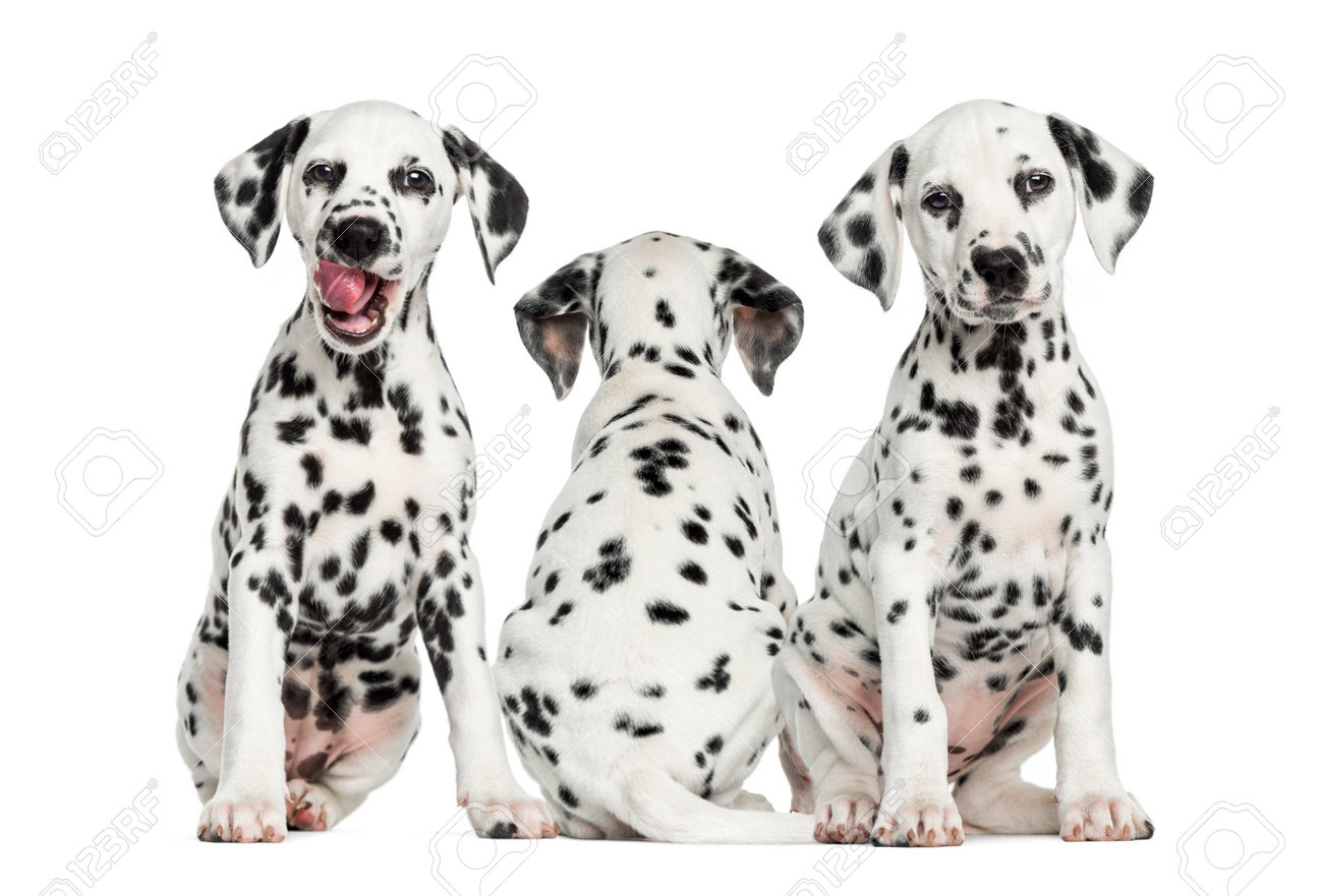 Dalmatian Puppies Sitting Together Isolated On White Stock Photo