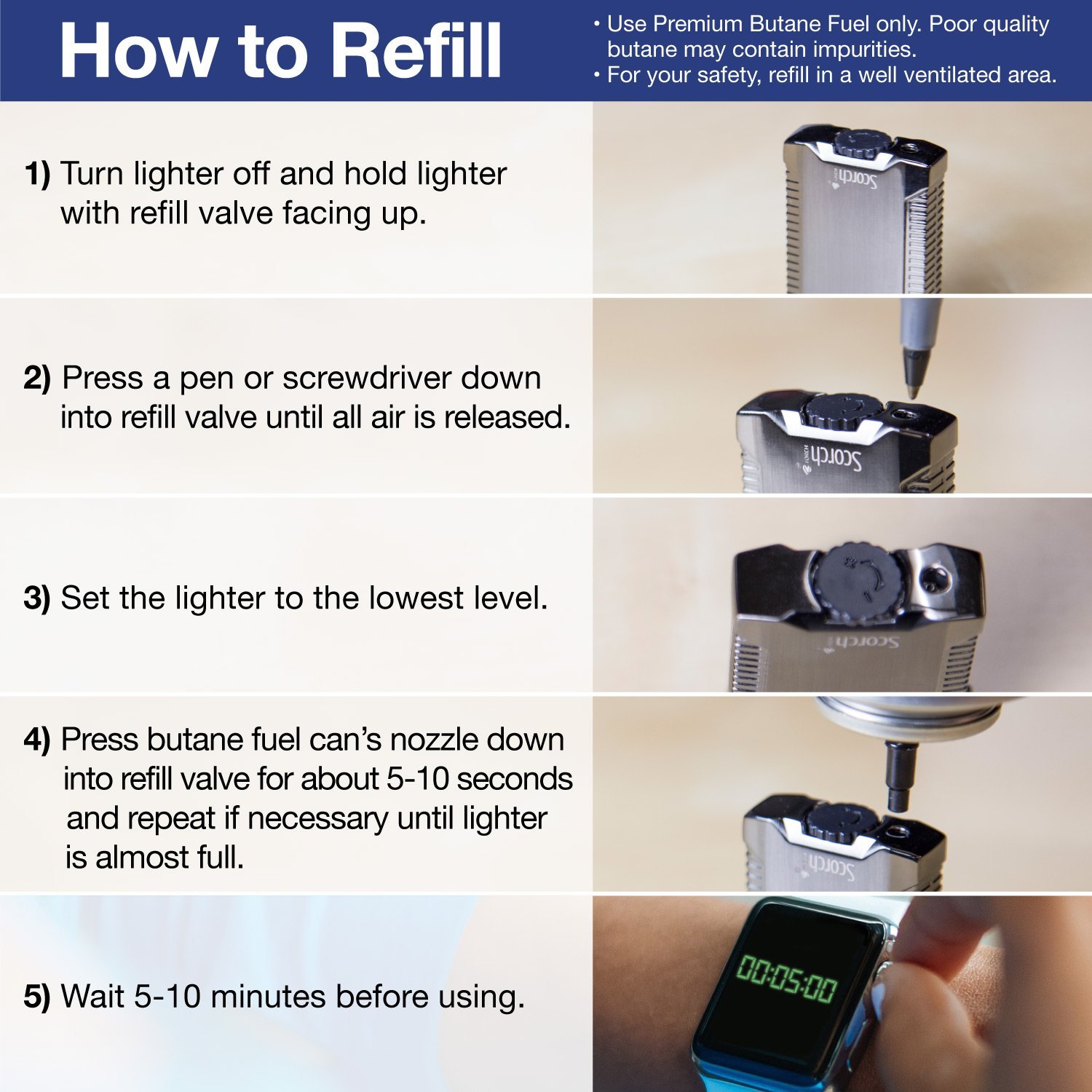 To refill your lighter please read and use the following instructions carefully.