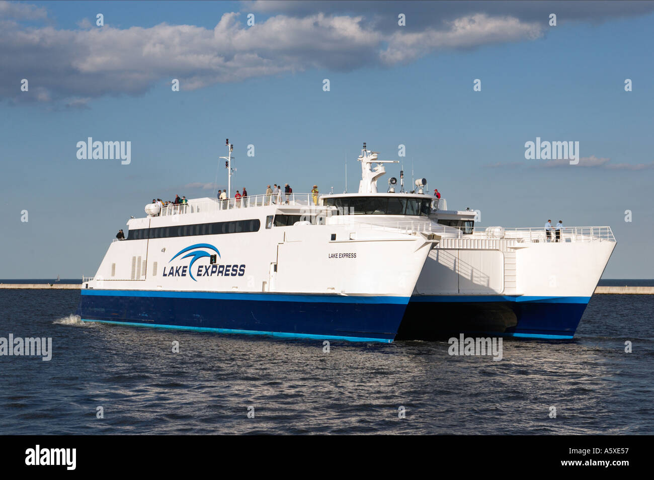 The lake express ferry made history as the first high speed auto passenger ferry in the united states on june 1 2004 when it re established the historic lake michigan ferry route between milwaukee wisconsin and muskegon michigan.