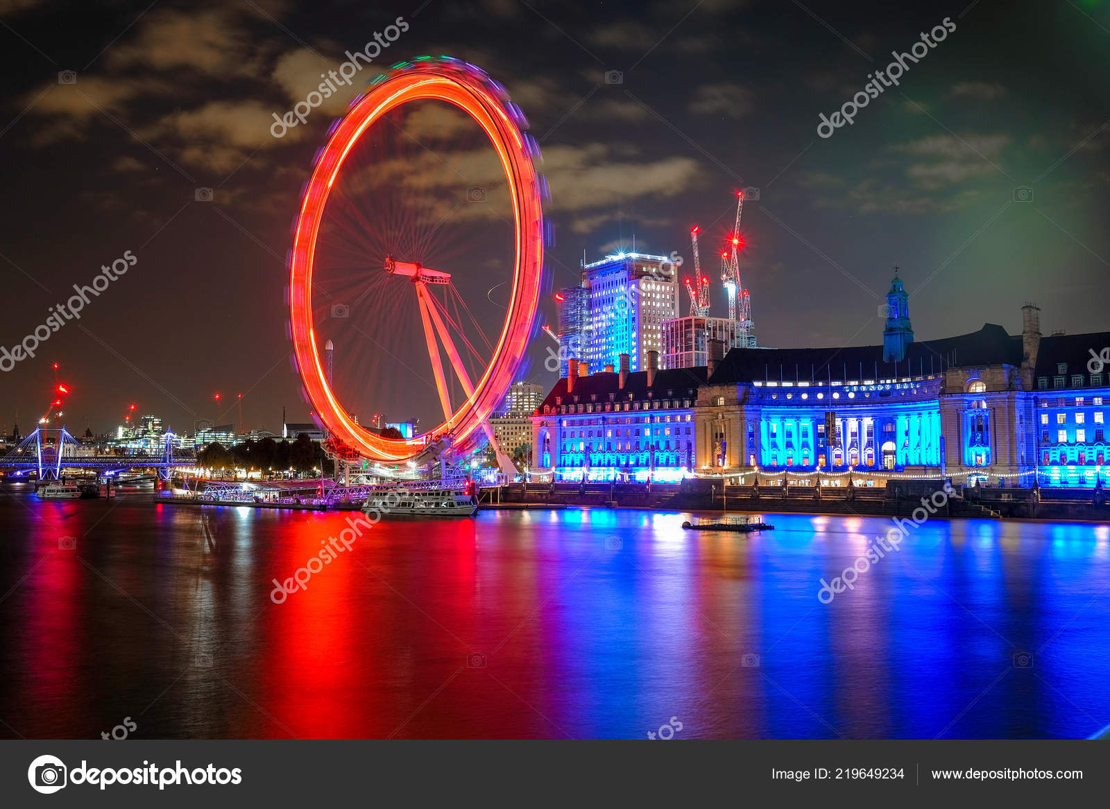 Night Shot The London Eye In Green County Hall River Thames Stock