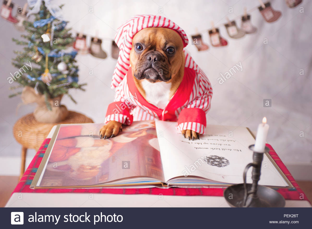 Red Fawn French Bulldog Dressed In Red And White Striped Pajamas