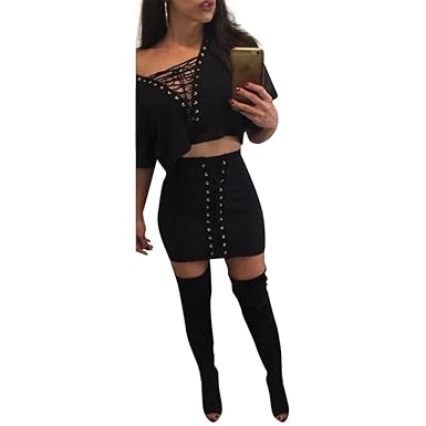 Amazon Com Women S Sexy 2pcs Lace Up Crop Top Skirt Midriff Baring