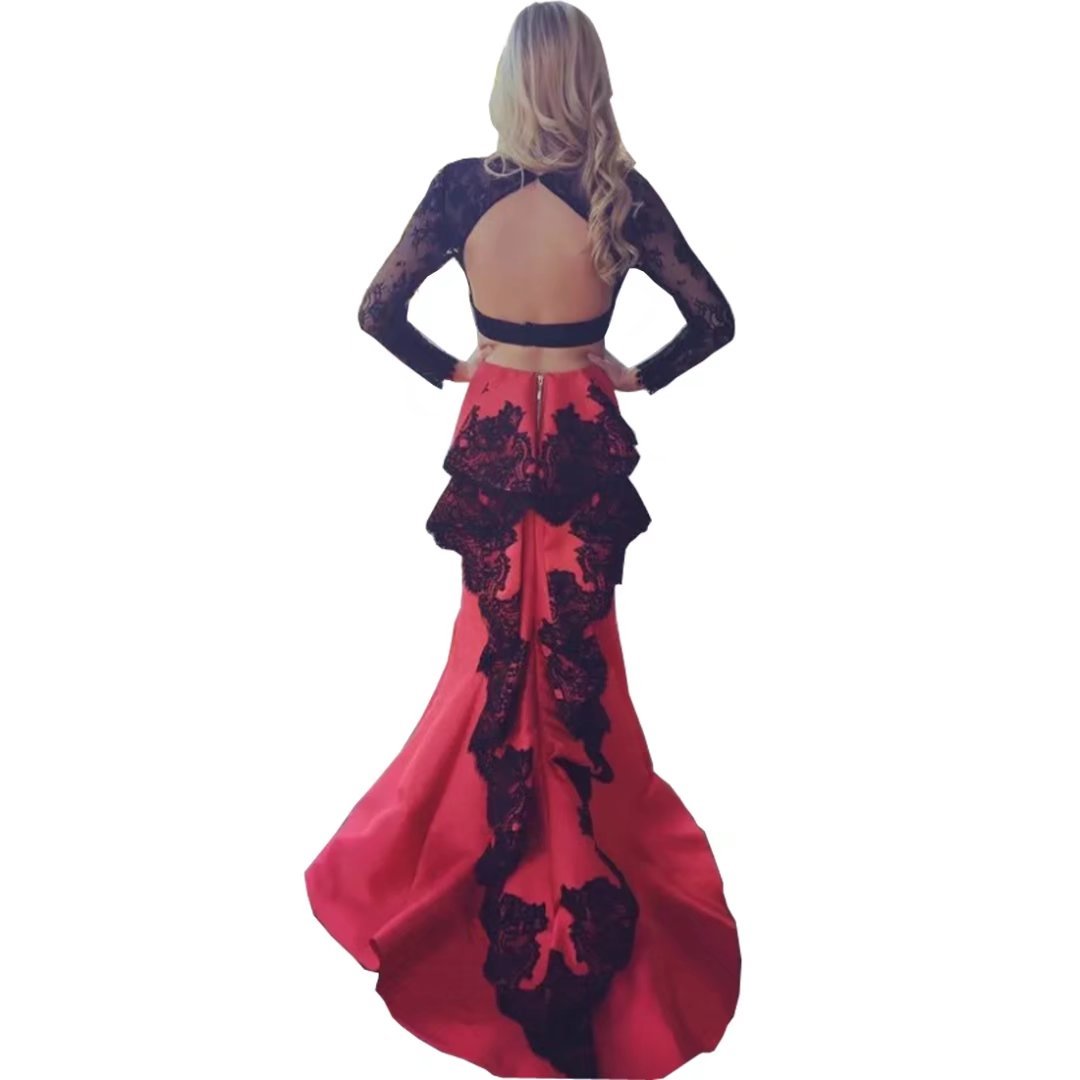 Red Two Piece Prom Dresses 2018 African Cheap Long Sleeve High Neck