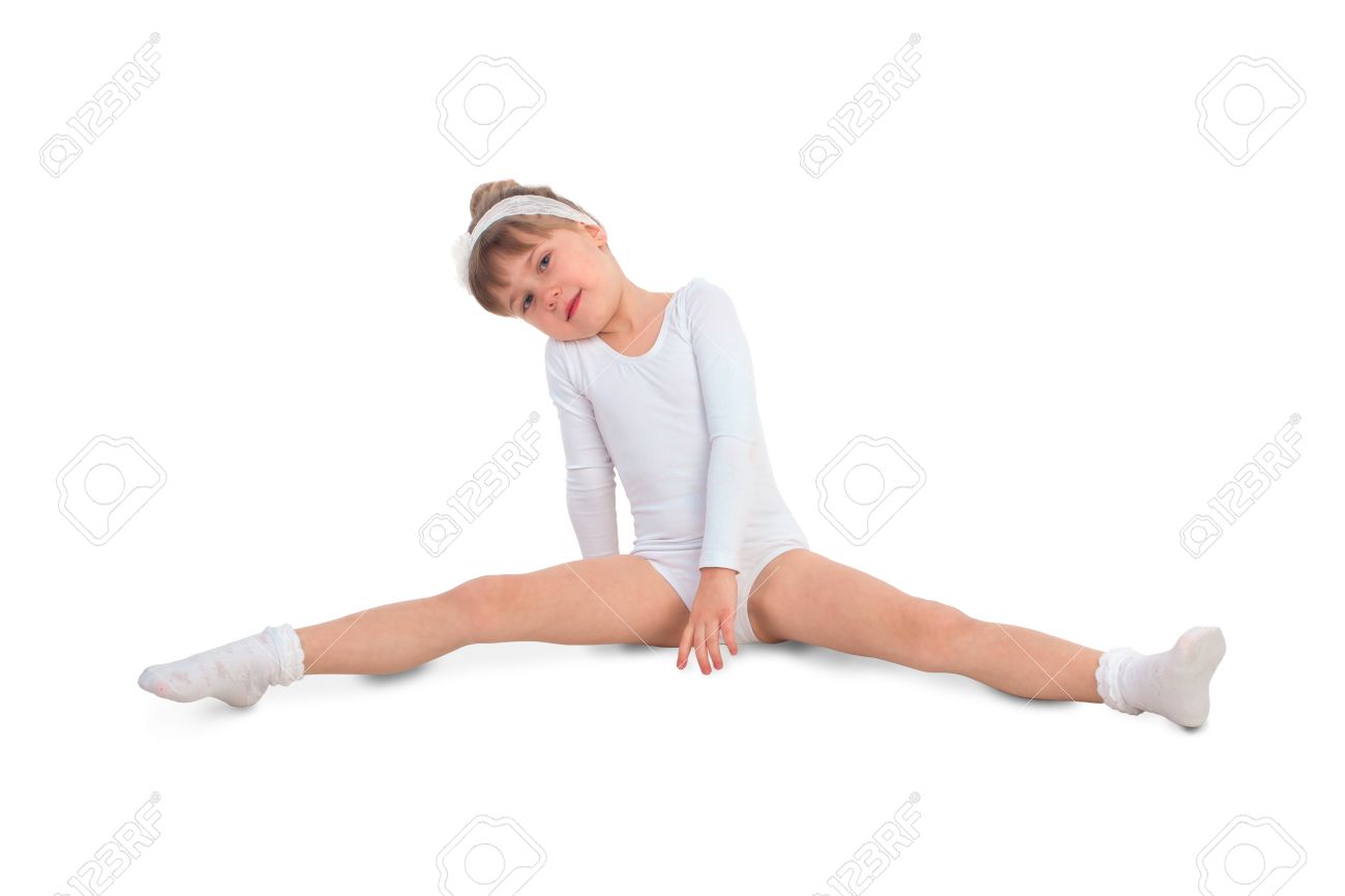 Young Girl Demonstrates The Splits In Ballet Leotards On A White