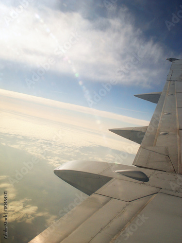 View From The Airplane Window You Can See The Wing And Turbine Sky