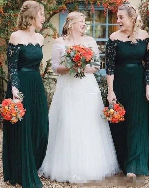 2019 Hunter Green Bridesmaid Dresses Off Shoulder Long Sleeve Lace