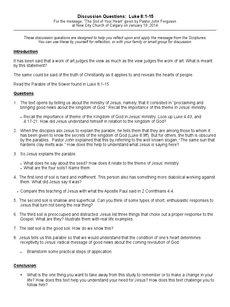 Reflection Questions The Soil Of Your Heart Luke 8 1 15 Gospel
