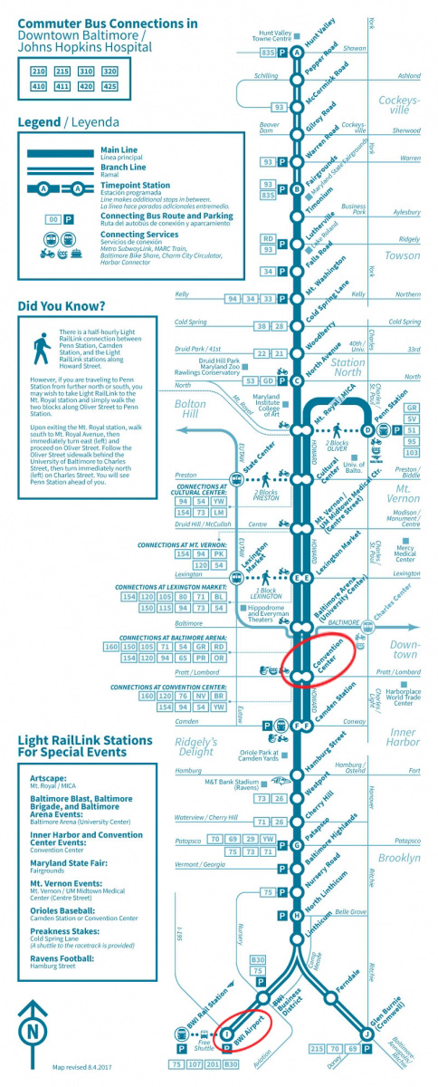 Light rail schedule light rail system map. The maryland transit administration light rail is a light rail system serving baltimore maryland united states and the surrounding suburbs. And two branches at the south end of the line that serve two stops apiece.
