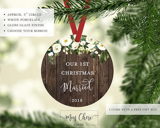 Amazon Com Rustic Wood Floral First Christmas Married Ornament