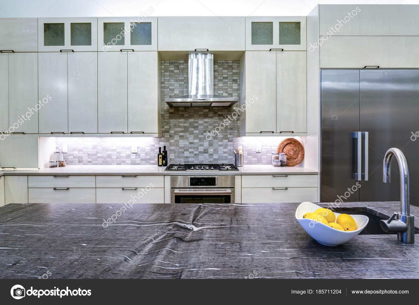 Contemporary White Kitchen With High End Kitchen Appliances Stock