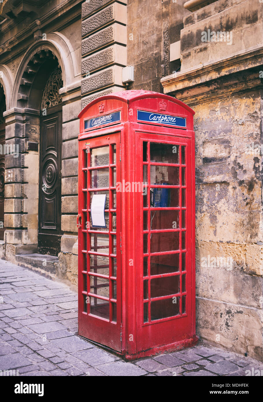 Red British Vintage Telephone Booth Outside Of A Sandstone Facade