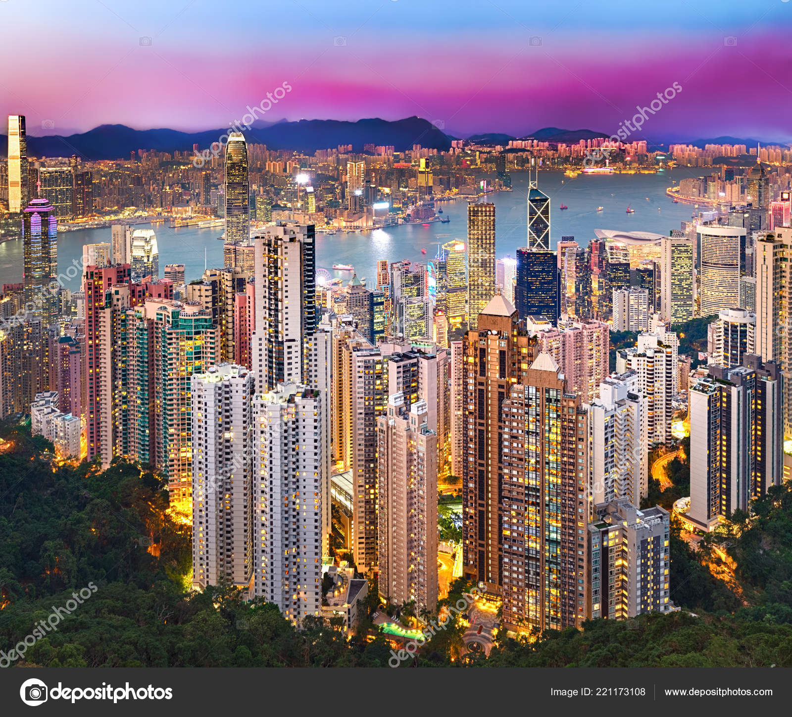 Hong Kong Skyline Sunset Night View Victoria Peak Stock Photo
