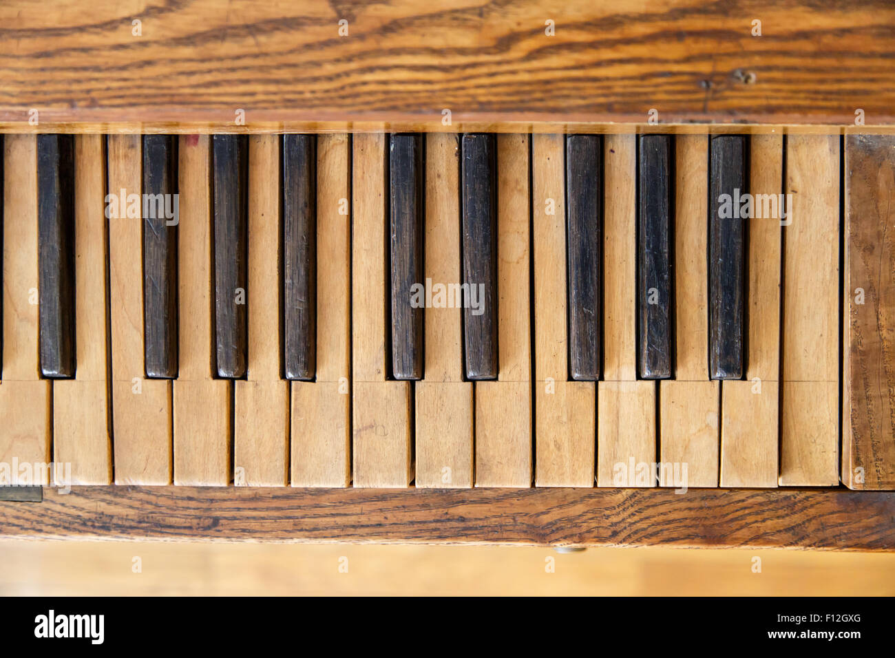 Close Up Top View Of Old Wooden Piano Wtih Brown And Black Keys